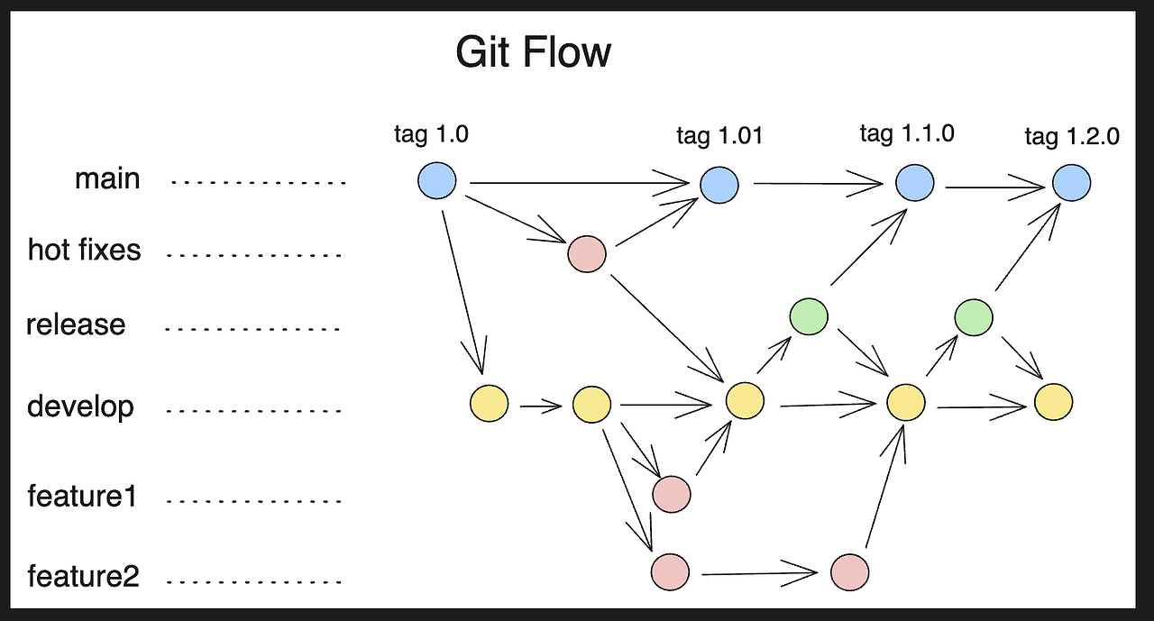 - Git Flow : 복잡한 프로젝트에 적합하며, 여러 개의 브랜치를 사용하여 기능 개발, 버그 수정, 배포 등을 관리합니다.